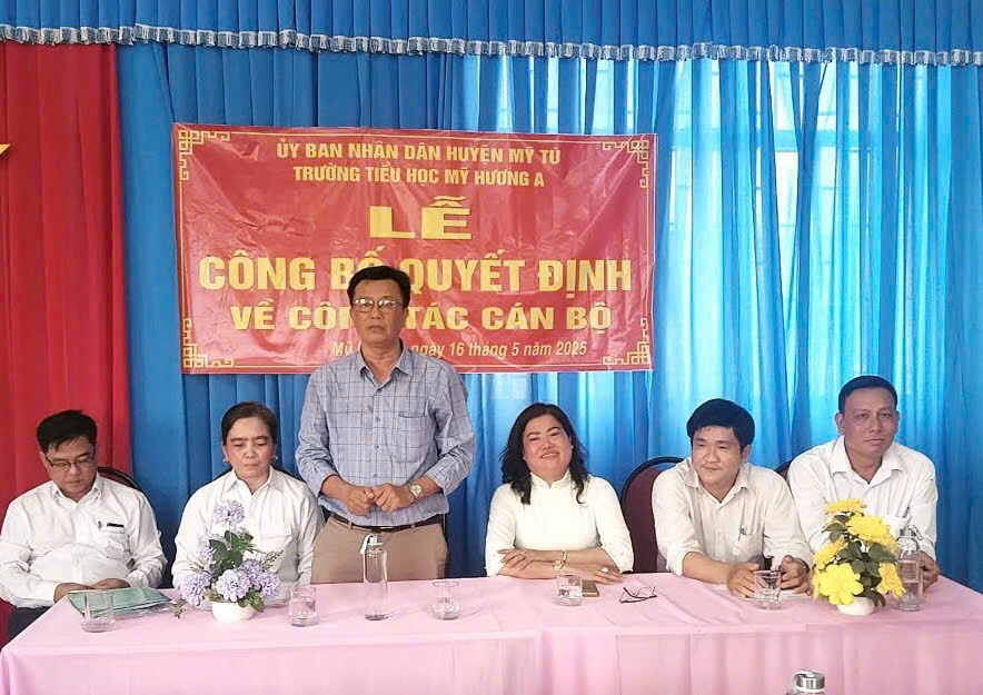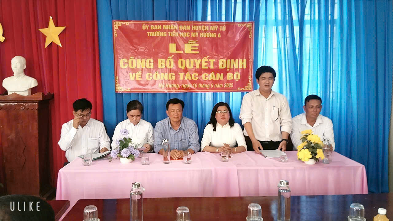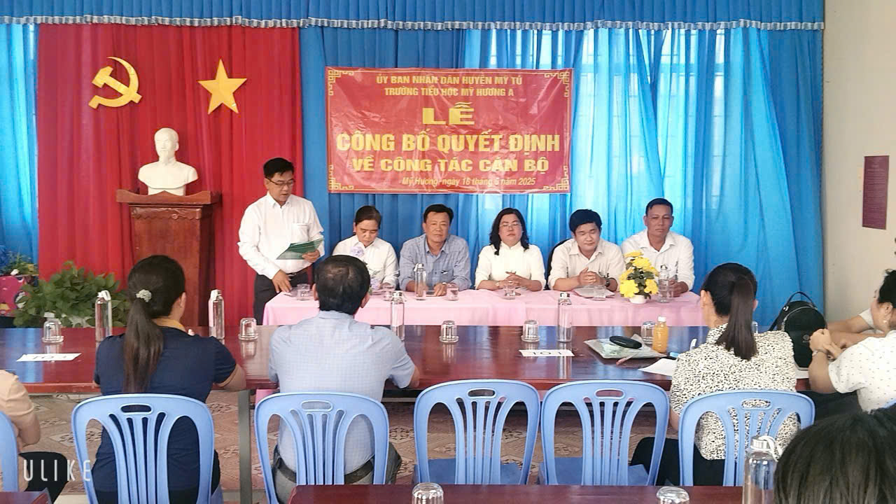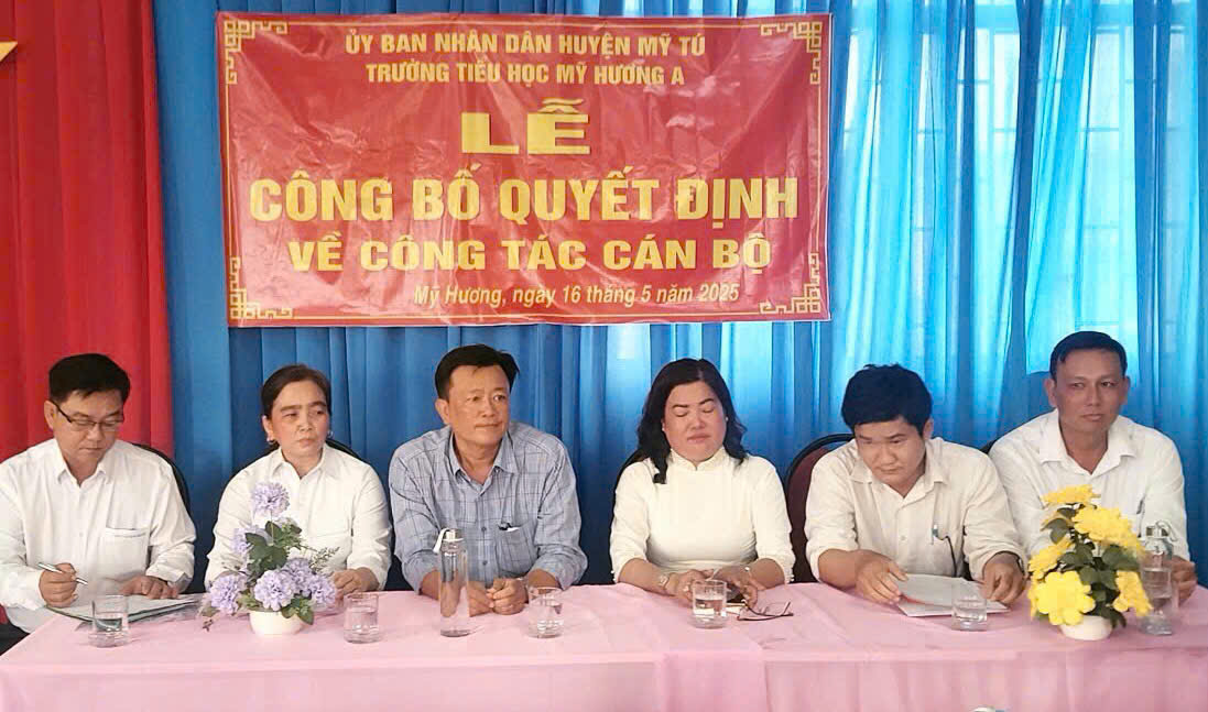 Chiều ngày 16/05/2025 tại trường Tiểu học Mỹ Hương A diễn ra buổi lễ công bố quyết định bổ nhiệm Hiệu trưởng cho bà Nguyễn Thị Bé Hiếu đến dự có ông Nguyễn Minh Trí, Huyện ủy viên, Trưởng phòng Giáo dục Đào tạo huyện Mỹ Tú; ông Hồ Hoàng Anh, Phó trưởng phòng nội vụ Huyện Mỹ Tú; bà Đặng Thị Út, Huyện uỷ viên, Bí thư Đảng uỷ xã Mỹ Hương; ông Bùi Minh Đương, Phó chủ tịch Uỷ ban nhân dân xã Mỹ Hương; Ông Lê Tấn Lai, Chuyên viên phòng Giáo dục Đào tạo huyện Mỹ Tú; bà Nguyễn Thị Út, Chuyên viên phòng nội vụ huyện Mỹ Tú; Cùng tập thể CB-GV-NV trường Tiểu học Mỹ Hương A.