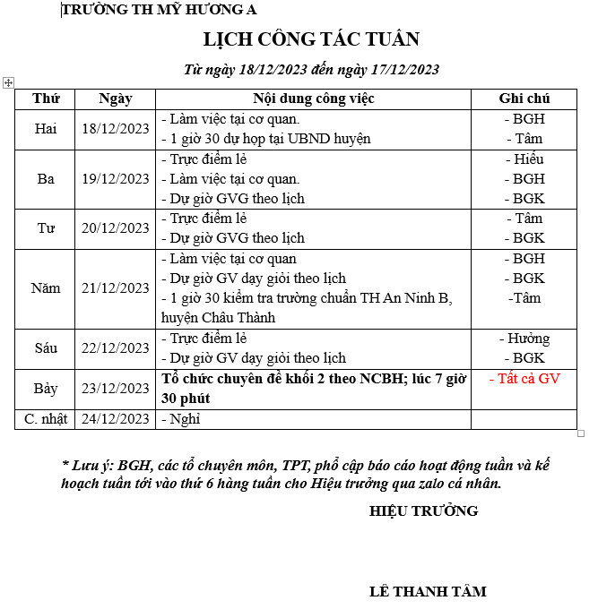 LỊCH CÔNG TÁC TUẦN (Từ ngày 18/12/2023 đến ngày 24/12/2023)