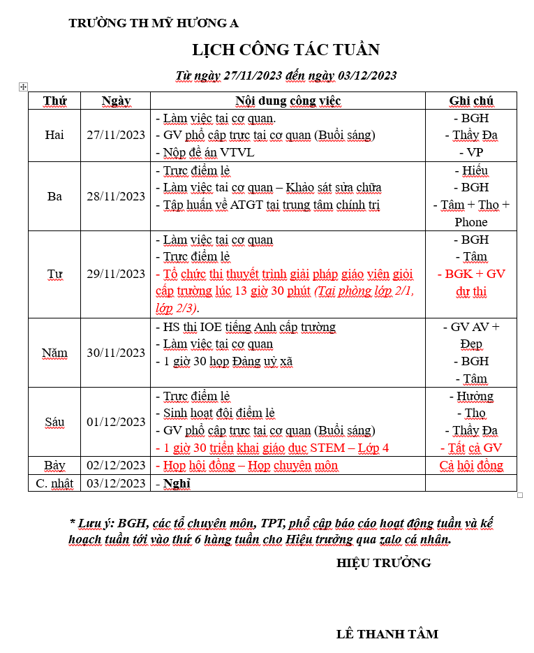 LỊCH CÔNG TÁC TUẦN (Từ ngày 27/11/2023 đến ngày 03/12/2023)
