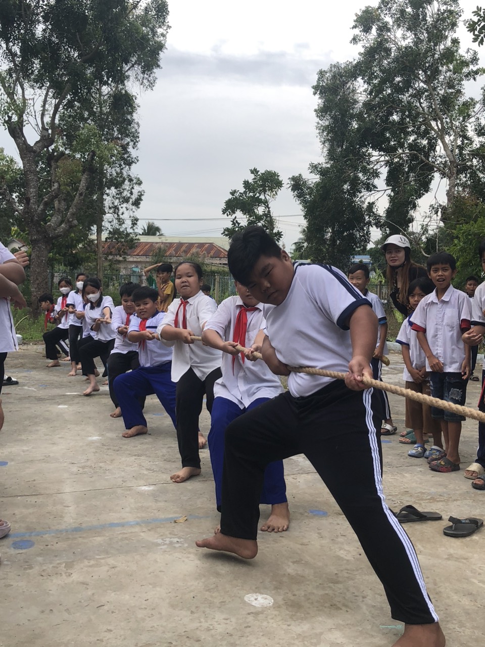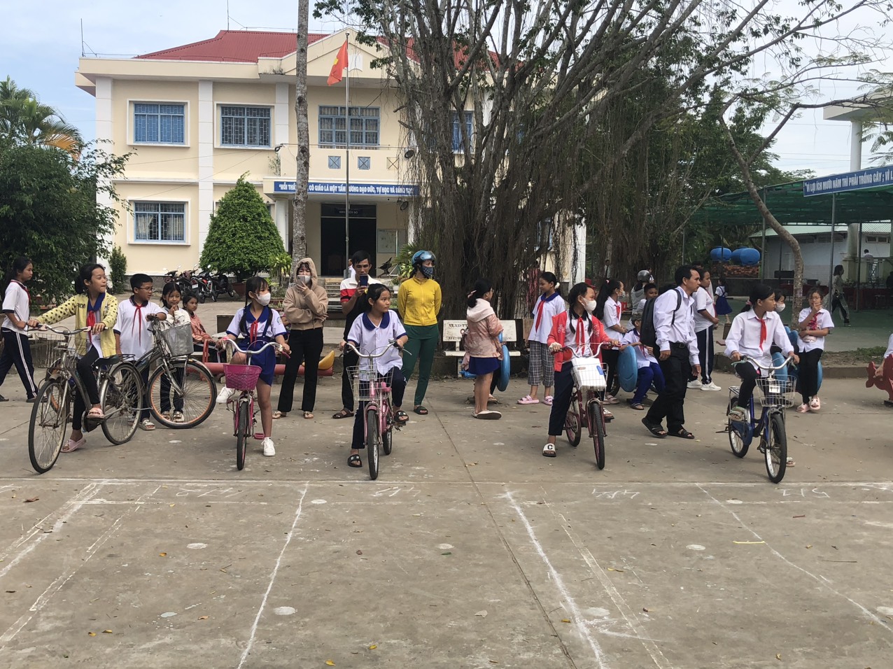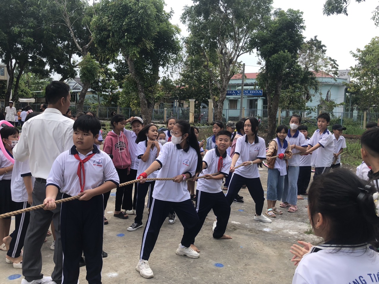 Kết thúc buổi lễ, Liên đội trường TH Mỹ Hương A tổ chức cho học sinh khối 4, 5 chơi trò chơi thi xe đạp chậm nam, nữ và thi kéo co: