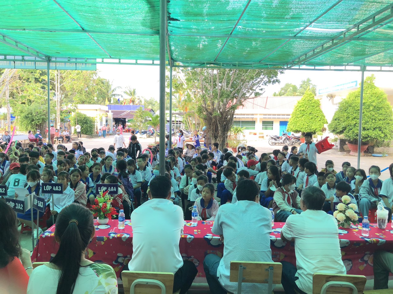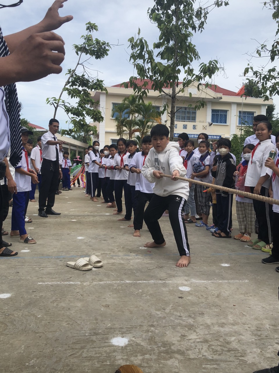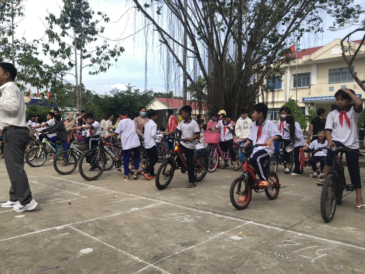 Kết thúc buổi lễ, Liên đội trường TH Mỹ Hương A tổ chức cho học sinh khối 4, 5 chơi trò chơi thi xe đạp chậm nam, nữ và thi kéo co: