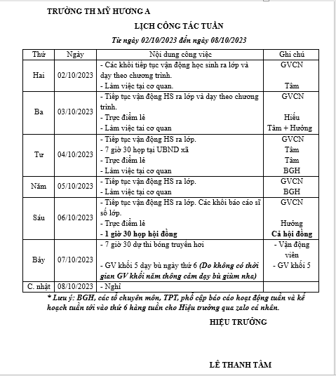 LỊCH CÔNG TÁC TUẦN (Từ ngày 02/10/2023 đến ngày 08/10/2023)