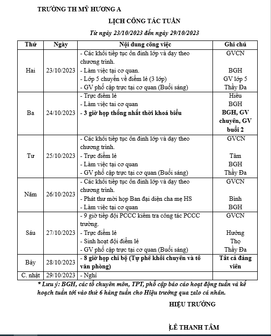 LỊCH CÔNG TÁC TUẦN (Từ ngày 23/10/2023 đến ngày 29/10/2023)
