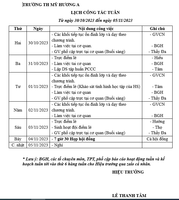 LỊCH CÔNG TÁC TUẦN (Từ ngày 30/10/2023 đến ngày 05/11/2023)